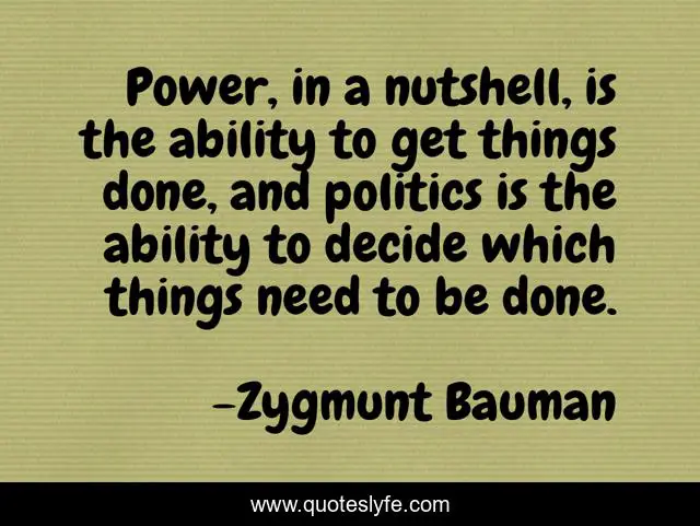 This page presents the quote "Power, in a nutshell, is the ability to get things done, and politics is the ability to decide which things need to be done.". Author of this quote is Zygmunt Bauman. This quote is about done, ability, power,.