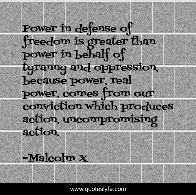 This page presents the quote "Power in defense of freedom is greater than power in behalf of tyranny and oppression, because power, real power, comes from our conviction which produces action, uncompromising action.". Author of this quote is Malcolm X. This quote is about action, freedom, oppression,.
