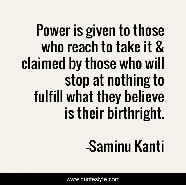 This page presents the quote "Power is given to those who reach to take it & claimed by those who will stop at nothing to fulfill what they believe is their birthright.". Author of this quote is Saminu Kanti. This quote is about politics, leadership, power,.