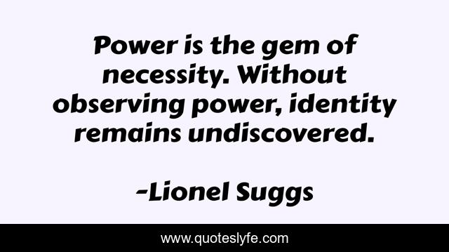 This page presents the quote "Power is the gem of necessity. Without observing power, identity remains undiscovered.". Author of this quote is Lionel Suggs. This quote is about powerlessness, suggsverse, power, lionel-suggs,.