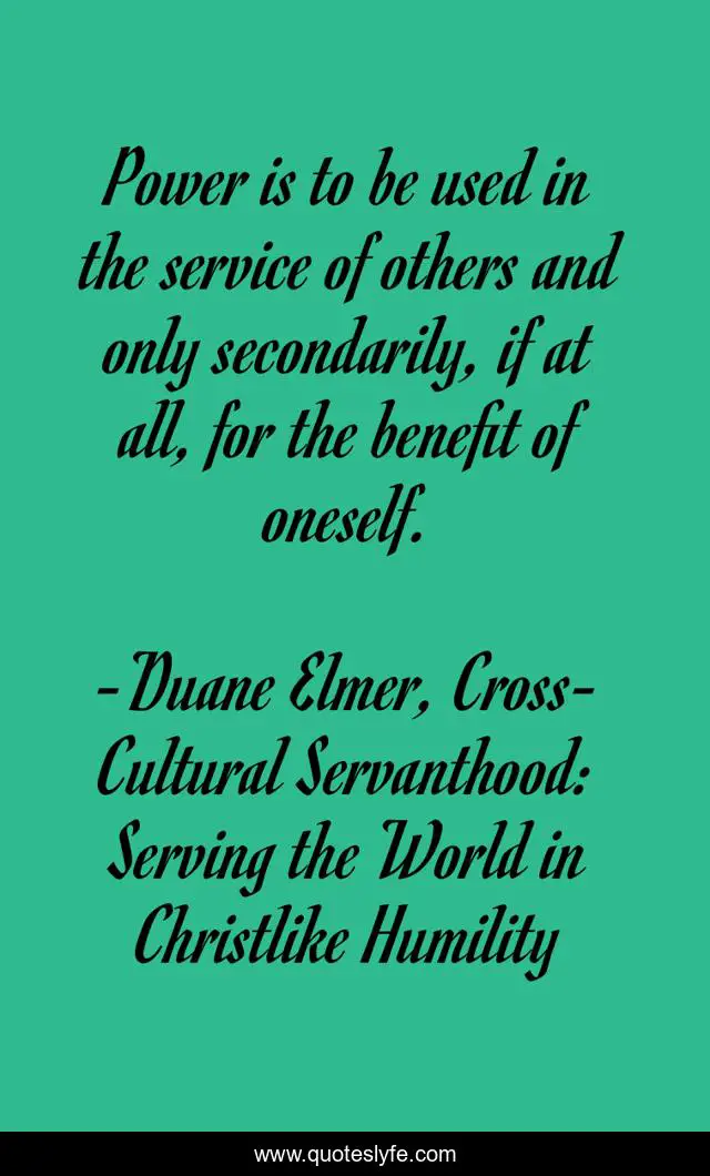 This page presents the quote "Power is to be used in the service of others and only secondarily, if at all, for the benefit of oneself.". Author of this quote is Duane Elmer, Cross-Cultural Servanthood: Serving the World in Christlike Humility. This quote is about servant, servanthood, power, service,.