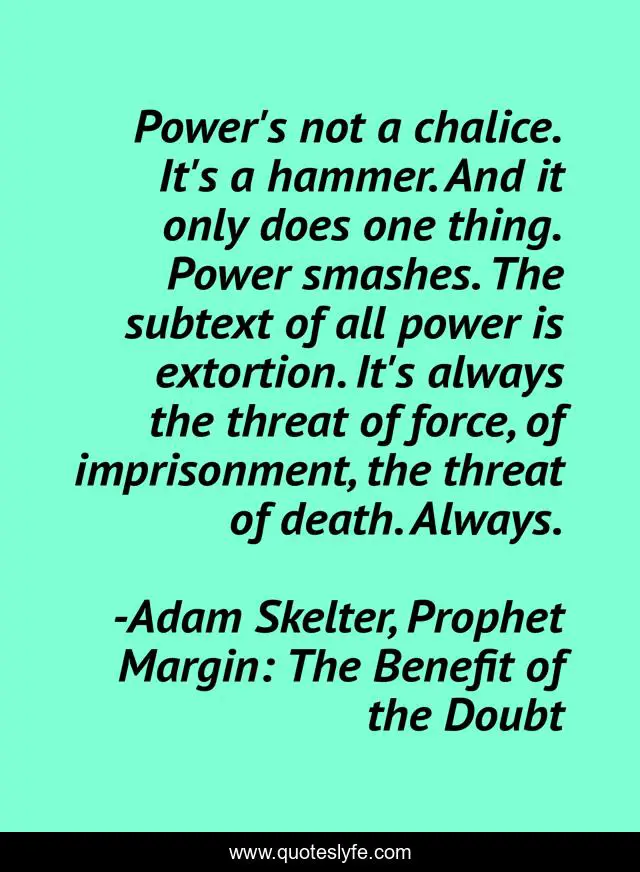 "Adam Skelter, Prophet Margin: The Benefit of the Doubt Quotes." Quoteslyfe.com, 2025. Sat. 06 Dec. 2025. <https://www.quoteslyfe.com/quote/Power-s-not-a-chalice-It-s-88359>.