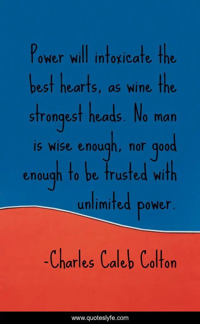 This page presents the quote "Power will intoxicate the best hearts, as wine the strongest heads. No man is wise enough, nor good enough to be trusted with unlimited power.". Author of this quote is Charles Caleb Colton. .