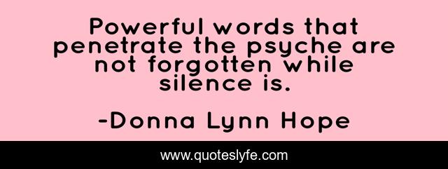 This page presents the quote "Powerful words that penetrate the psyche are not forgotten while silence is.". Author of this quote is Donna Lynn Hope. This quote is about silent-treatment, ignored, silence, words, ignoring,.