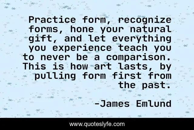 This page presents the quote "Practice form, recognize forms, hone your natural gift, and let everything you experience teach you to never be a comparison. This is how art lasts, by pulling form first from the past.". Author of this quote is James Emlund. This quote is about artistry, artists-life, art, form, natural, inspiration,.