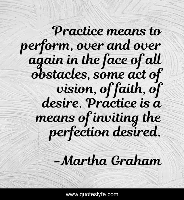 This page presents the quote "Practice means to perform, over and over again in the face of all obstacles, some act of vision, of faith, of desire. Practice is a means of inviting the perfection desired.". Author of this quote is Martha Graham. This quote is about perfection, vision,.