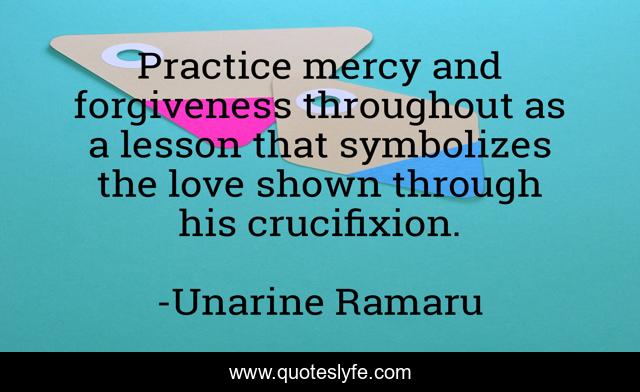 This page presents the quote "Practice mercy and forgiveness throughout as a lesson that symbolizes the love shown through his crucifixion.". Author of this quote is Unarine Ramaru. This quote is about jesus-christ, mercy, love, forgiveness, good-friday, christianity, religion, brotherhood, crucifixion,.