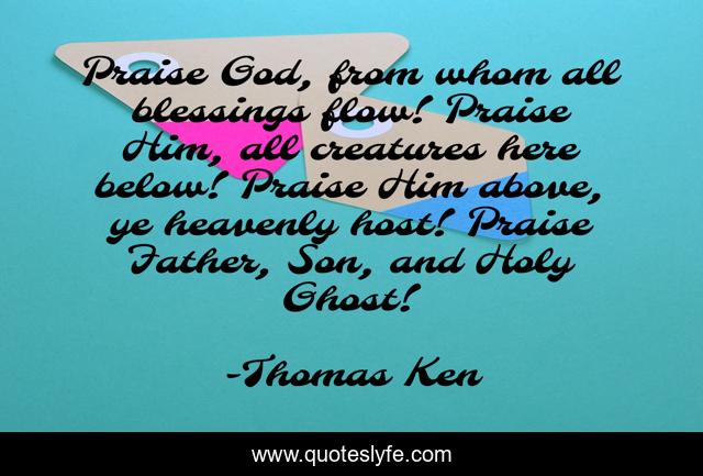 This page presents the quote "Praise God, from whom all blessings flow! Praise Him, all creatures here below! Praise Him above, ye heavenly host! Praise Father, Son, and Holy Ghost!". Author of this quote is Thomas Ken. This quote is about blessings, father, son,.