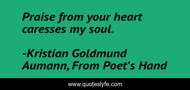 This page presents the quote "Praise from your heart caresses my soul.". Author of this quote is Kristian Goldmund Aumann, From Poet's Hand. This quote is about heart, soul, praise,.