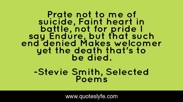 This page presents the quote "Prate not to me of suicide, Faint heart in battle, not for pride I say Endure, but that such end denied Makes welcomer yet the death that's to be died.". Author of this quote is Stevie Smith, Selected Poems. This quote is about life, death, dying, suicide, endure, study-to-deserve-death,.