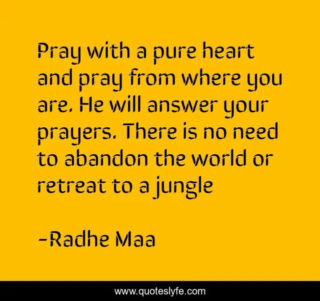 This page presents the quote "Pray with a pure heart and pray from where you are. He will answer your prayers. There is no need to abandon the world or retreat to a jungle". Author of this quote is Radhe Maa. This quote is about spiritual, radhe-guru-maa, spiritual-leader, radhe-maa, spiritual-sayings, wisdom, quotes-and-saying, inner-peace, spiritual-insights,.