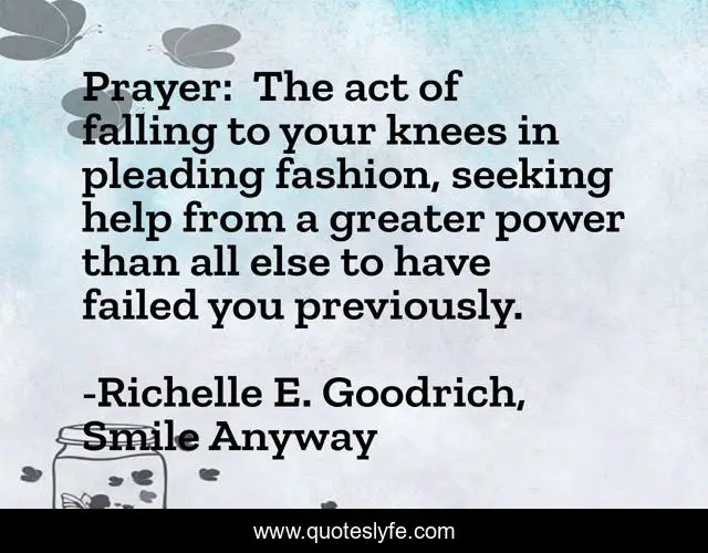 This page presents the quote "Prayer: The act of falling to your knees in pleading fashion, seeking help from a greater power than all else to have failed you previously.". Author of this quote is Richelle E. Goodrich, Smile Anyway. This quote is about help, supplication, richelle, pleading, prayer, richelle-goodrich,.