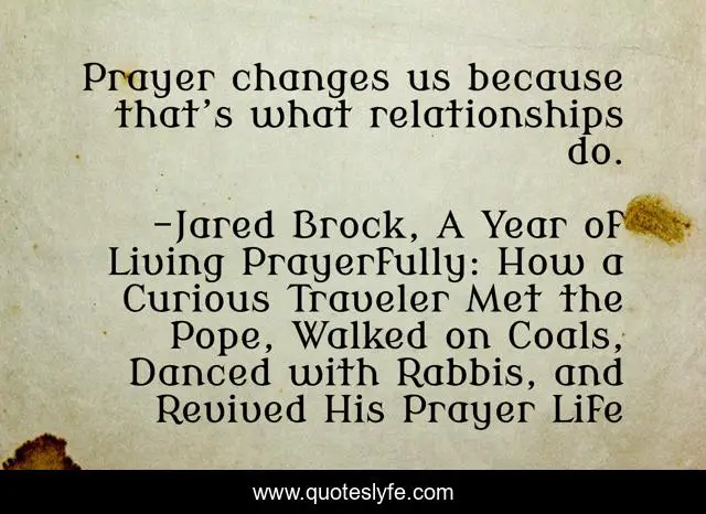 "Jared Brock, A Year of Living Prayerfully: How a Curious Traveler Met the Pope, Walked on Coals, Danced with Rabbis, and Revived His Prayer Life Quotes." Quoteslyfe.com, 2025. Fri. 05 Dec. 2025. <https://www.quoteslyfe.com/quote/Prayer-changes-us-because-that-s-what-115094>.