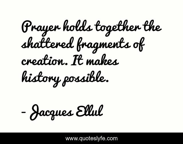 This page presents the quote "Prayer holds together the shattered fragments of creation. It makes history possible.". Author of this quote is Jacques Ellul. This quote is about history, prayer,.