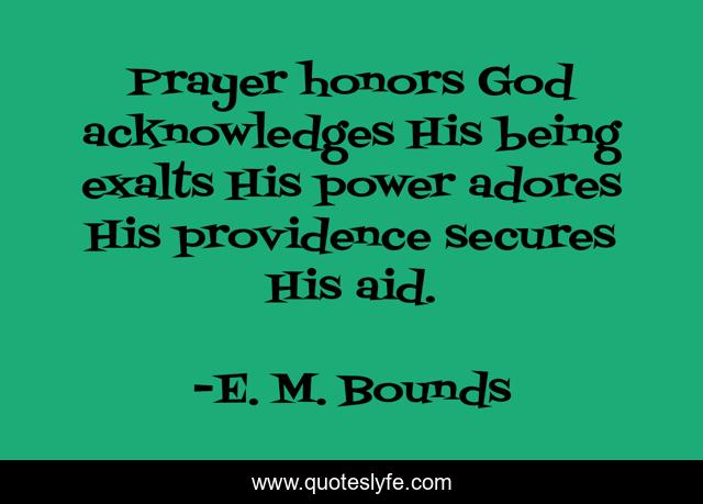 This page presents the quote "Prayer honors God acknowledges His being exalts His power adores His providence secures His aid.". Author of this quote is E. M. Bounds. .