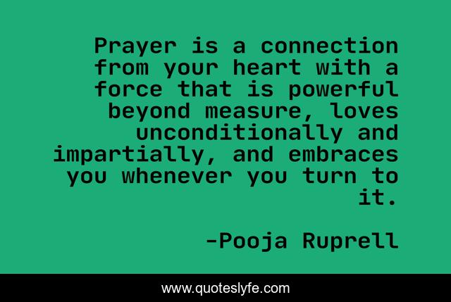 This page presents the quote "Prayer is a connection from your heart with a force that is powerful beyond measure, loves unconditionally and impartially, and embraces you whenever you turn to it.". Author of this quote is Pooja Ruprell. This quote is about perseverance, passion, prayer,.