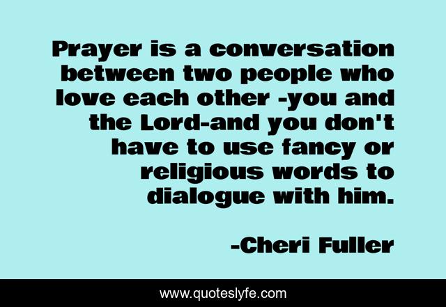 This page presents the quote "Prayer is a conversation between two people who love each other -you and the Lord-and you don't have to use fancy or religious words to dialogue with him.". Author of this quote is Cheri Fuller. .