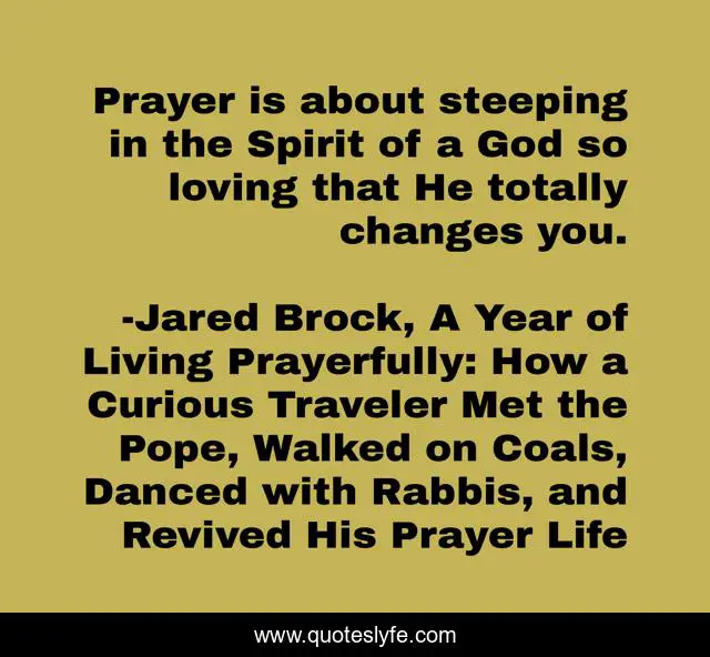 "Jared Brock, A Year of Living Prayerfully: How a Curious Traveler Met the Pope, Walked on Coals, Danced with Rabbis, and Revived His Prayer Life Quotes." Quoteslyfe.com, 2025. Fri. 05 Dec. 2025. <https://www.quoteslyfe.com/quote/Prayer-is-about-steeping-in-the-Spirit-115093>.