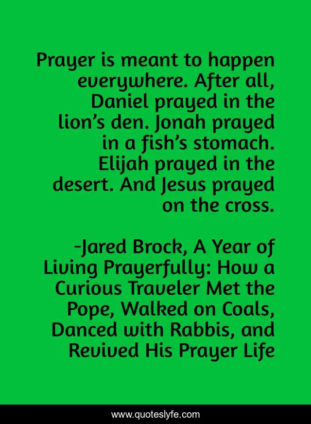This page presents the quote "Prayer is meant to happen everywhere. After all, Daniel prayed in the lion’s den. Jonah prayed in a fish’s stomach. Elijah prayed in the desert. And Jesus prayed on the cross.". Author of this quote is Jared Brock, A Year of Living Prayerfully: How a Curious Traveler Met the Pope, Walked on Coals, Danced with Rabbis, and Revived His Prayer Life. This quote is about prayer-life, prayers, pray, cross, jesus, elijah, daniel, prayer, praying,.