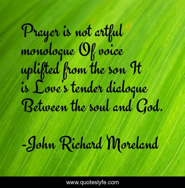 This page presents the quote "Prayer is not artful monologue Of voice uplifted from the son It is Love's tender dialogue Between the soul and God.". Author of this quote is John Richard Moreland. .