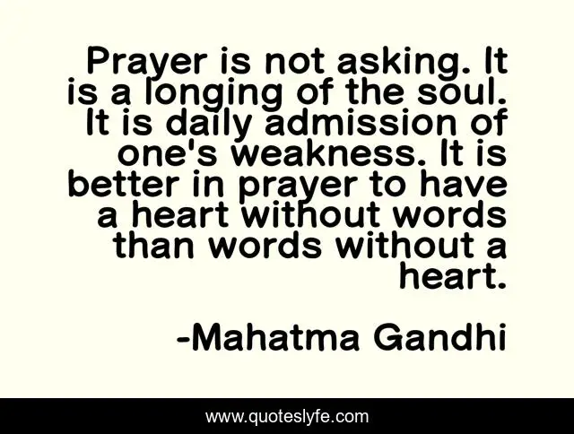 This page presents the quote "Prayer is not asking. It is a longing of the soul. It is daily admission of one's weakness. It is better in prayer to have a heart without words than words without a heart.". Author of this quote is Mahatma Gandhi. This quote is about heart, god, prayer, souls, religion, inspirational, weakness, enthusiasm, humanity,.