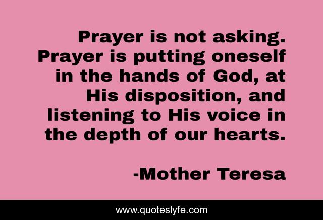 This page presents the quote "Prayer is not asking. Prayer is putting oneself in the hands of God, at His disposition, and listening to His voice in the depth of our hearts.". Author of this quote is Mother Teresa. .