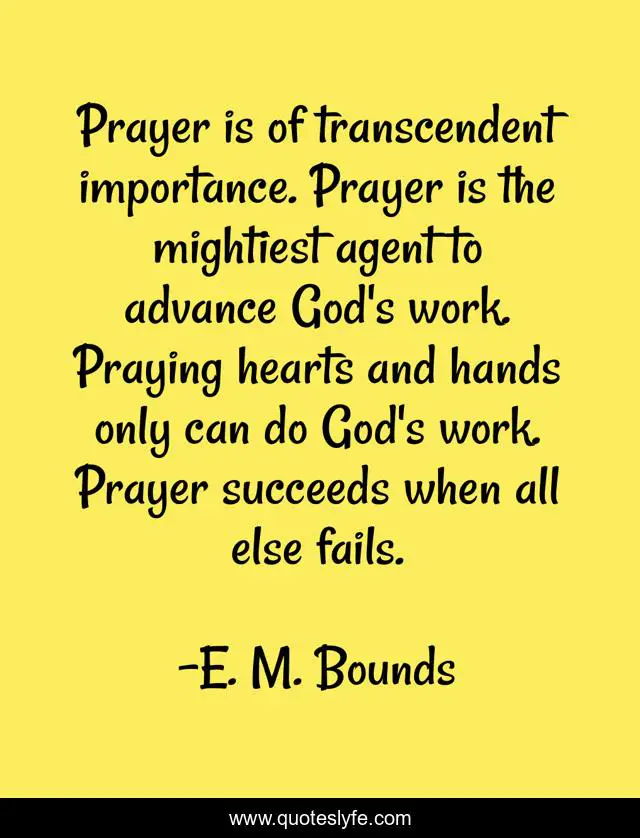 This page presents the quote "Prayer is of transcendent importance. Prayer is the mightiest agent to advance God's work. Praying hearts and hands only can do God's work. Prayer succeeds when all else fails.". Author of this quote is E. M. Bounds. .
