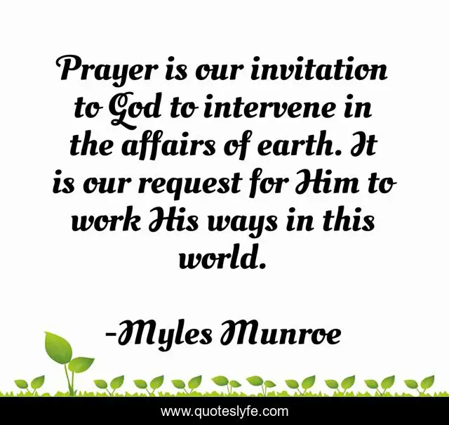 This page presents the quote "Prayer is our invitation to God to intervene in the affairs of earth. It is our request for Him to work His ways in this world.". Author of this quote is Myles Munroe. This quote is about god, prayer, world,.