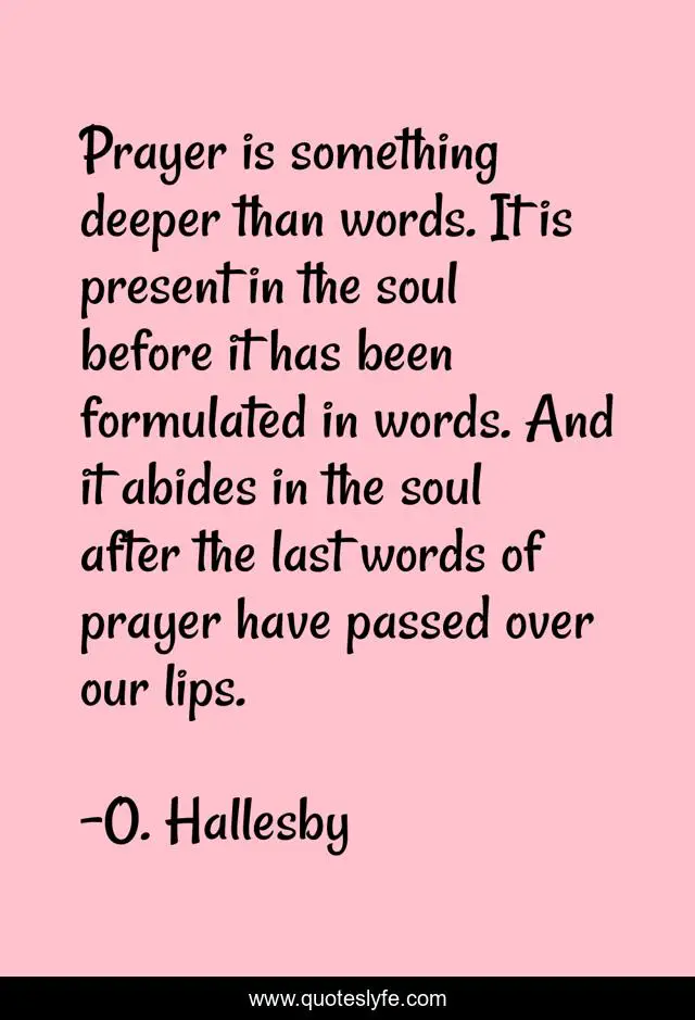 This page presents the quote "Prayer is something deeper than words. It is present in the soul before it has been formulated in words. And it abides in the soul after the last words of prayer have passed over our lips.". Author of this quote is O. Hallesby. .