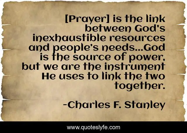 This page presents the quote "[Prayer] is the link between God's inexhaustible resources and people’s needs...God is the source of power, but we are the instrument He uses to link the two together.". Author of this quote is Charles F. Stanley. This quote is about enthusiasm, inspirational, prayer,.