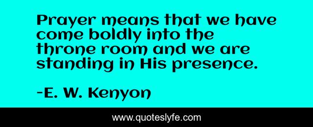 This page presents the quote "Prayer means that we have come boldly into the throne room and we are standing in His presence.". Author of this quote is E. W. Kenyon. .