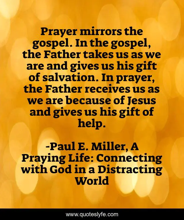 This page presents the quote "Prayer mirrors the gospel. In the gospel, the Father takes us as we are and gives us his gift of salvation. In prayer, the Father receives us as we are because of Jesus and gives us his gift of help.". Author of this quote is Paul E. Miller, A Praying Life: Connecting with God in a Distracting World. This quote is about gospel, prayer,.