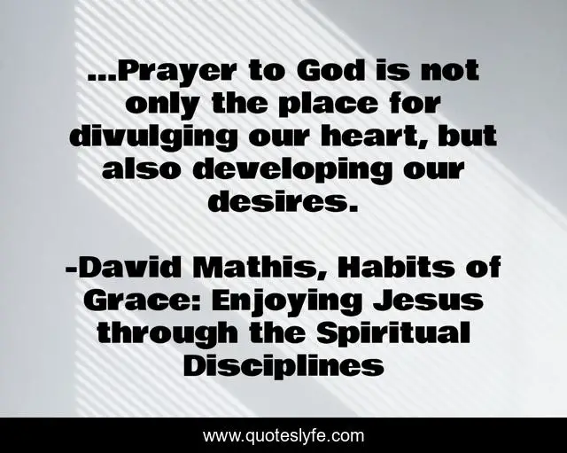 This page presents the quote "…Prayer to God is not only the place for divulging our heart, but also developing our desires.". Author of this quote is David Mathis, Habits of Grace: Enjoying Jesus through the Spiritual Disciplines. .