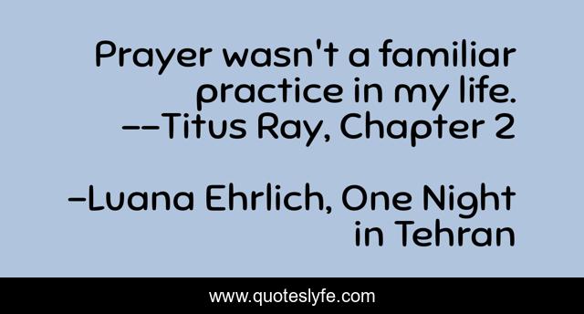 This page presents the quote "Prayer wasn't a familiar practice in my life. --Titus Ray, Chapter 2". Author of this quote is Luana Ehrlich, One Night in Tehran. This quote is about goodreads, titus-ray, prayer,.