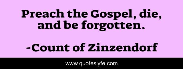 This page presents the quote "Preach the Gospel, die, and be forgotten.". Author of this quote is Count of Zinzendorf. This quote is about die, gospel, forget, preach,.