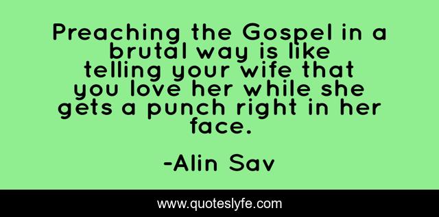 This page presents the quote "Preaching the Gospel in a brutal way is like telling your wife that you love her while she gets a punch right in her face.". Author of this quote is Alin Sav. This quote is about spirituality, life, church,.