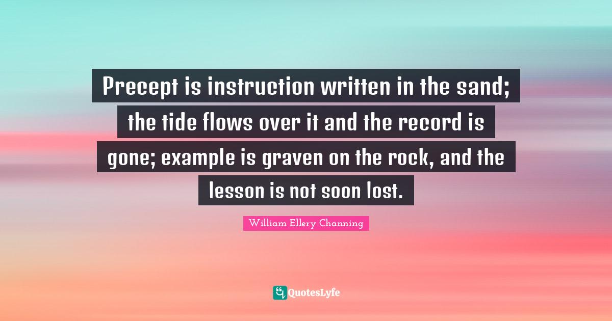 This page presents the quote "Precept is instruction written in the sand; the tide flows over it and the record is gone; example is graven on the rock, and the lesson is not soon lost.". Author of this quote is William Ellery Channing. This quote is about example, instruction, gone, over it, lost, sand, rocks, written,.