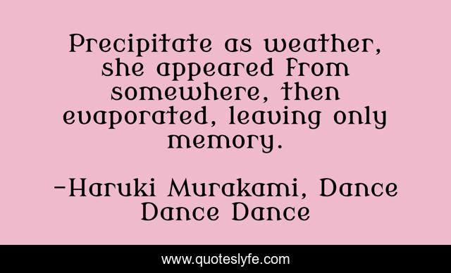 This page presents the quote "Precipitate as weather, she appeared from somewhere, then evaporated, leaving only memory.". Author of this quote is Haruki Murakami, Dance Dance Dance. This quote is about evaporation, disappearance, weather, memory,.
