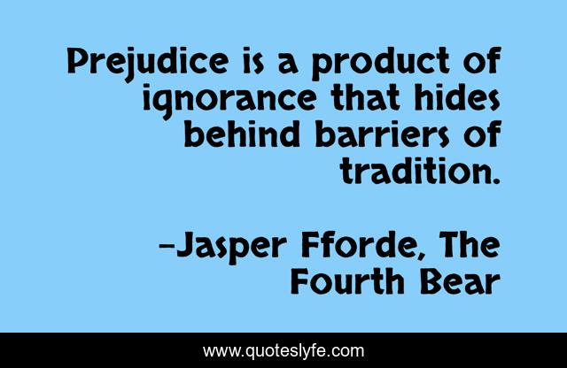 This page presents the quote "Prejudice is a product of ignorance that hides behind barriers of tradition.". Author of this quote is Jasper Fforde, The Fourth Bear. This quote is about prejudice, ignorance,.