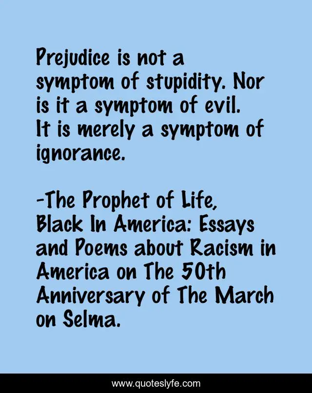"The Prophet of Life, Black In America: Essays and Poems about Racism in America on The 50th Anniversary of The March on Selma. Quotes." Quoteslyfe.com, 2025. Sat. 06 Dec. 2025. <https://www.quoteslyfe.com/quote/Prejudice-is-not-a-symptom-of-stupidity-241516>.