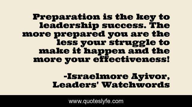 This page presents the quote "Preparation is the key to leadership success. The more prepared you are the less your struggle to make it happen and the more your effectiveness!". Author of this quote is Israelmore Ayivor, Leaders' Watchwords. This quote is about key, food-for-thought, make-it-happen, leaders, lead, successful, prepare, success, leader,.