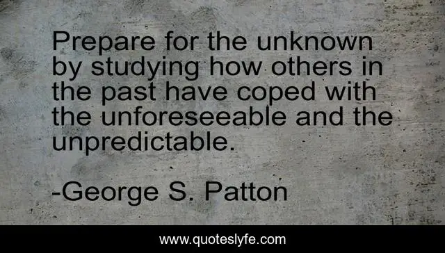 This page presents the quote "Prepare for the unknown by studying how others in the past have coped with the unforeseeable and the unpredictable.". Author of this quote is George S. Patton. This quote is about past, studying, unknown,.