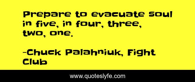 This page presents the quote "Prepare to evacuate soul in five, in four, three, two, one.". Author of this quote is Chuck Palahniuk, Fight Club. This quote is about soul, evacuate,.