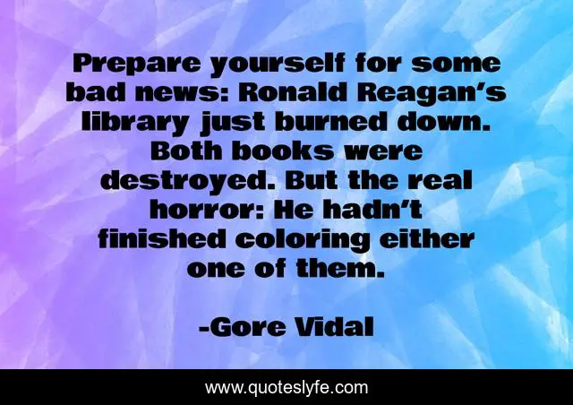 This page presents the quote "Prepare yourself for some bad news: Ronald Reagan’s library just burned down. Both books were destroyed. But the real horror: He hadn’t finished coloring either one of them.". Author of this quote is Gore Vidal. This quote is about funny, humor, political, reagan, fun, politics, comedy, ronald-reagan, gore-vidal,.