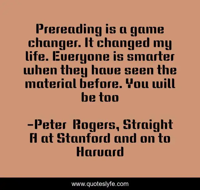 This page presents the quote "Prereading is a game changer. It changed my life. Everyone is smarter when they have seen the material before. You will be too". Author of this quote is Peter Rogers, Straight A at Stanford and on to Harvard. This quote is about class-preparation, speed-learning, pre-reading, learn-faster, better-grades, biochemistry, crush-sat, memory, study-skills,.