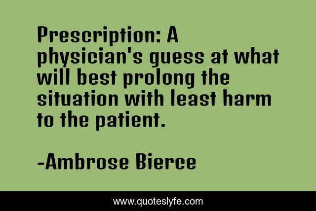 This page presents the quote "Prescription: A physician's guess at what will best prolong the situation with least harm to the patient.". Author of this quote is Ambrose Bierce. This quote is about physician, best, situation,.