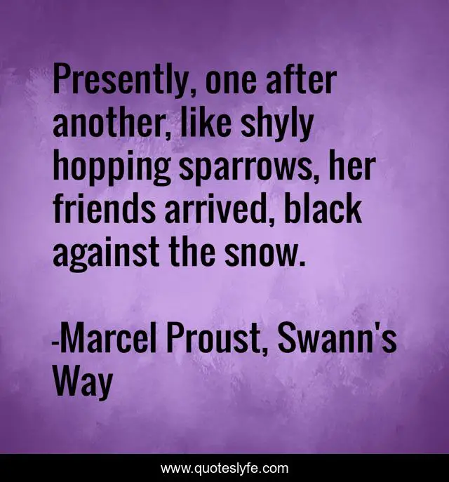 This page presents the quote "Presently, one after another, like shyly hopping sparrows, her friends arrived, black against the snow.". Author of this quote is Marcel Proust, Swann's Way. This quote is about gilberte, sparrows, friends,.