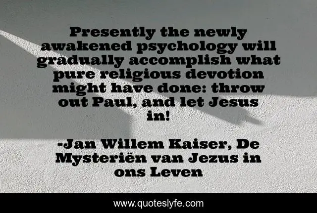 This page presents the quote "Presently the newly awakened psychology will gradually accomplish what pure religious devotion might have done: throw out Paul, and let Jesus in!". Author of this quote is Jan Willem Kaiser, De Mysteriën van Jezus in ons Leven. This quote is about spirituality, acim,.