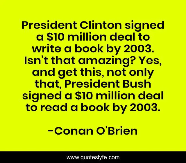 This page presents the quote "President Clinton signed a $10 million deal to write a book by 2003. Isn't that amazing? Yes, and get this, not only that, President Bush signed a $10 million deal to read a book by 2003.". Author of this quote is Conan O'Brien. This quote is about president, yes, book,.