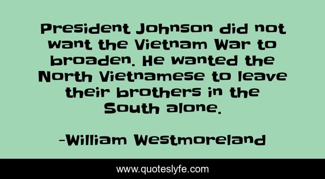 This page presents the quote "President Johnson did not want the Vietnam War to broaden. He wanted the North Vietnamese to leave their brothers in the South alone.". Author of this quote is William Westmoreland. This quote is about alone, president,.
